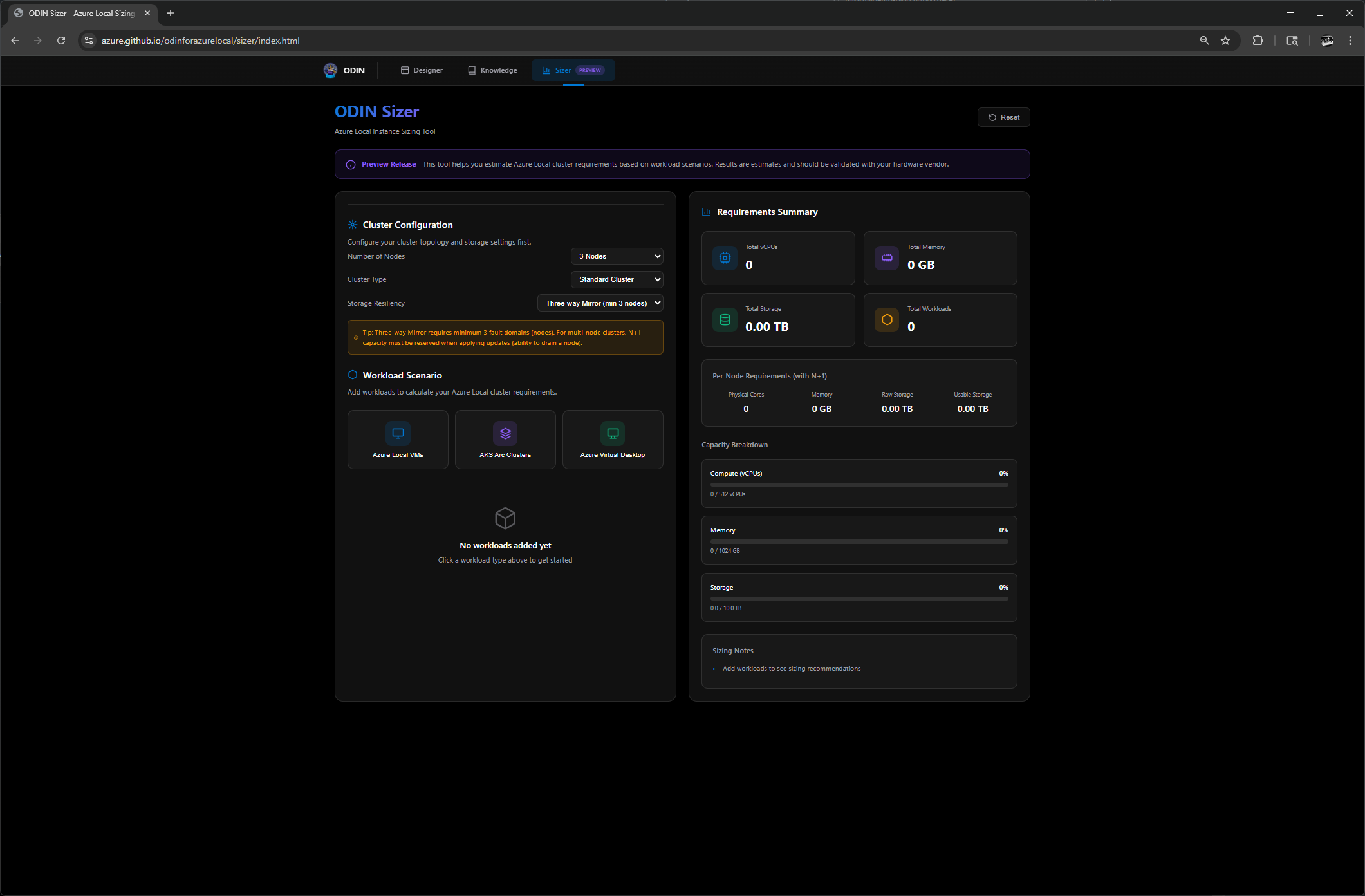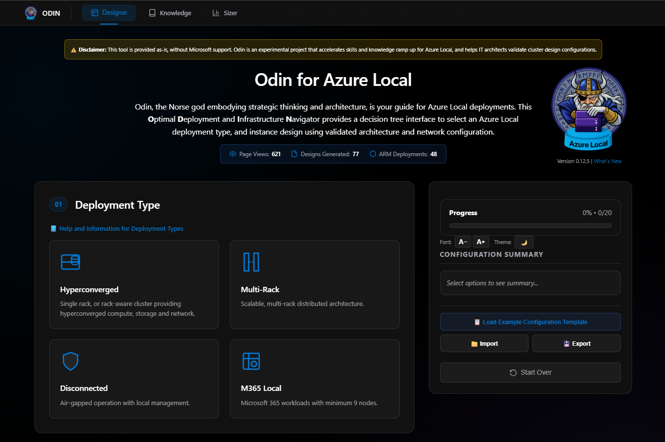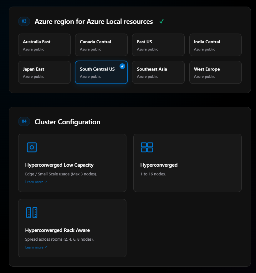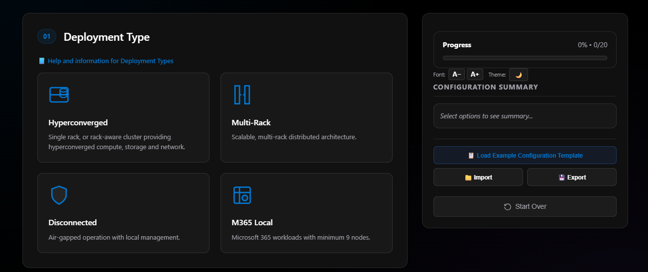 Odin is a browser-based wizard that walks you through the decisions required to configure an Azure Local deployment. It’s a decision tree—you make selections, and it guides you through the implications of those choices.