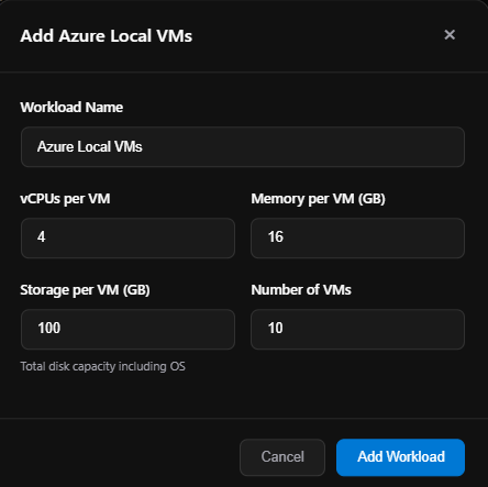 - Azure Local VMs: Inputs for workload name, vCPUs per VM, memory per VM (GB), storage per VM (GB), and number of VMs.