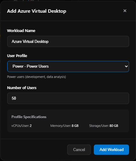 - Azure Virtual Desktop (AVD): Choose a user profile (Light, Medium, Power), number of users, and see the per-profile specs (vCPUs, memory, storage).