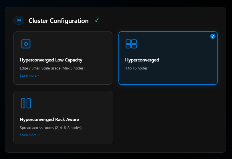 - Deployment type (Hyperconverged, Multi-Rack, Disconnected, M365 Local)