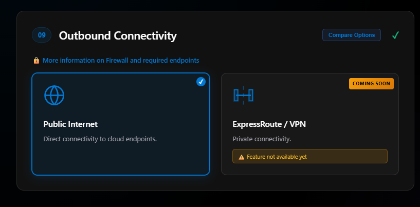 - A Knowledge base with in-depth guidance on outbound connectivity, Arc Gateway, and private endpoints