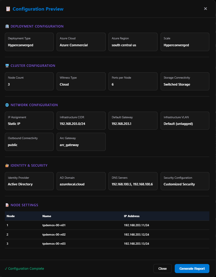 Now we’re ready to preview our cluster configuration! This pops up an overview of the config. If “Configuration Complete” is green at the bottom, click Generate Report.