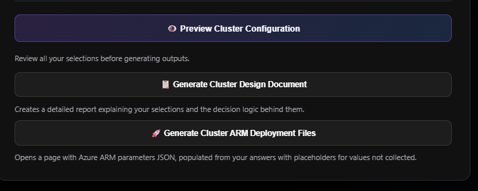 At the end, you can preview your cluster configuration, generate a detailed design document explaining the decision logic behind your selections, and export ARM deployment parameters (with placeholders for uncollected values).